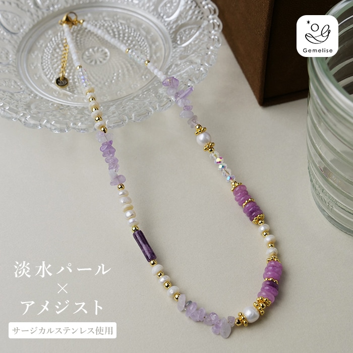 Gemelise ジェメリース 淡水パール×天然石(アメジスト/メノウ)ネックレス 950226