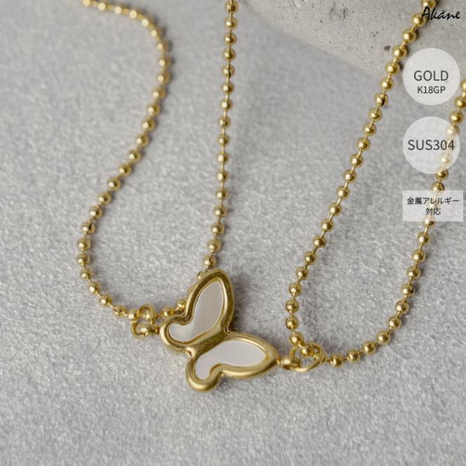 ステンレス304製 2連ネックレス 【蝶々 シェル】 1本 フラワー K18コーティング 重ね付け アレルギー対応