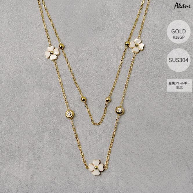 ステンレス304製 2連ネックレス 【花 シェル】1本 フラワー K18コーティング 重ね付け アレルギー対応