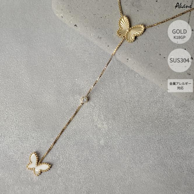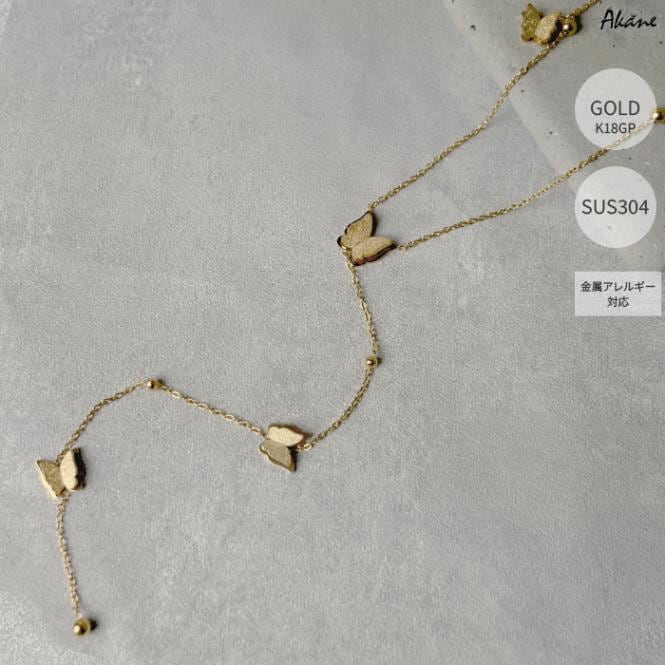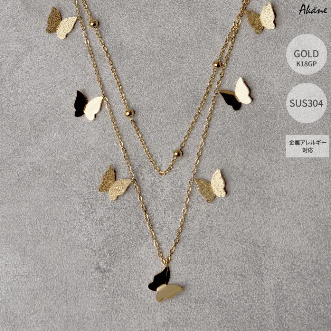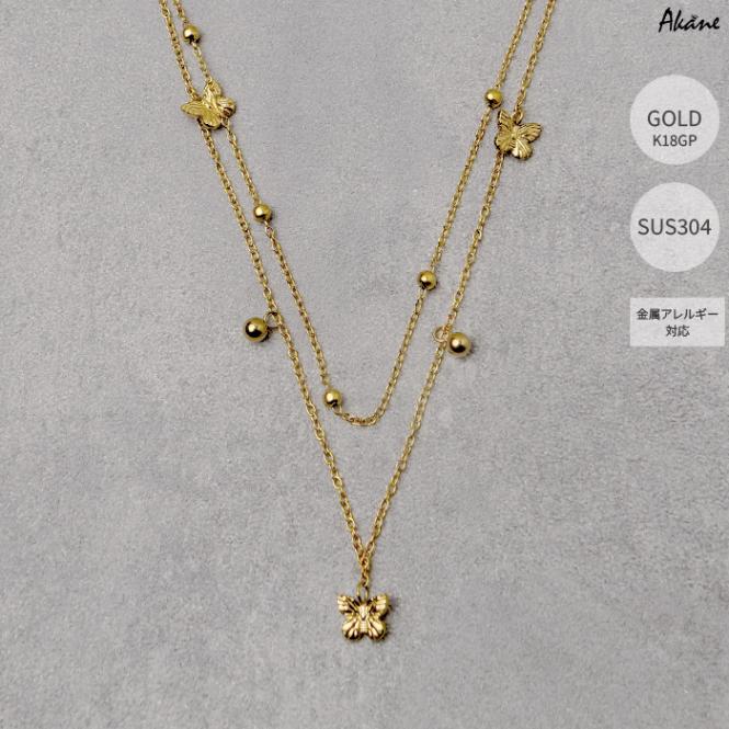 ステンレス304製 2連ネックレス 【蝶々】1本モチーフ K18コーティング 重ね付け アレルギー対応