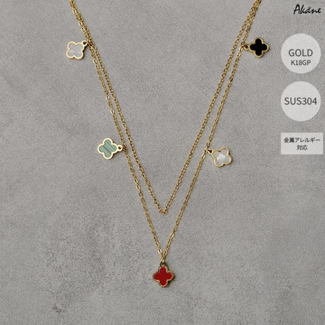 ステンレス304製 2連 ネックレス 【 四つ葉 クローバー】約8.5mmアズキチェーン 1本 アレルギー対応