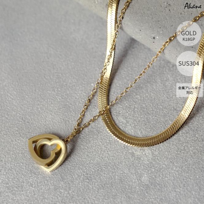ステンレス304製 2連ネックレス 【ハート】約10mm スネークチェーン1本 重ね付け アレルギー対応