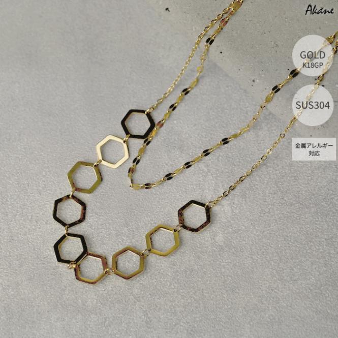 ステンレス304製 2連ネックレス 【六角形】10mm 1本 ハニカム K18コーティング 重ね付け アレルギー対応