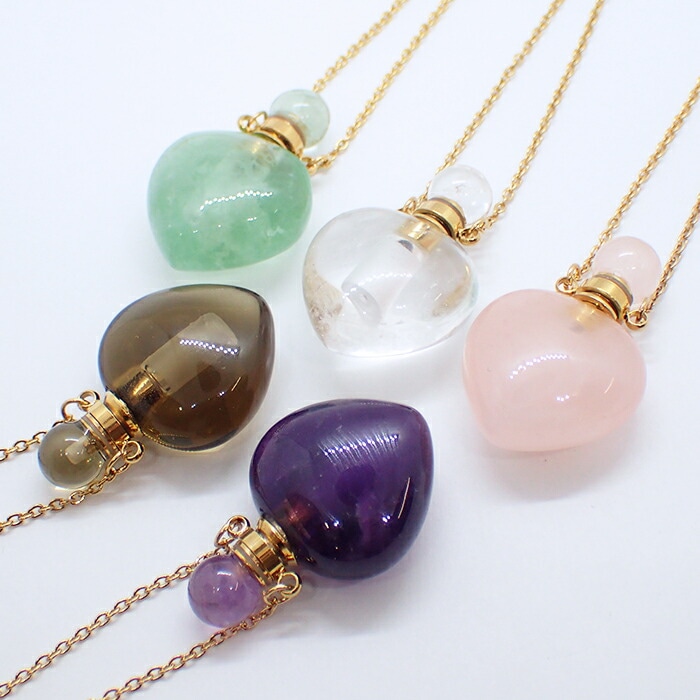 【天然石 ハート Bタイプ 香水瓶 ネックレス】カットジュエル型キャップ ステンレスチェーン アクセサリー アロマ ペンダント