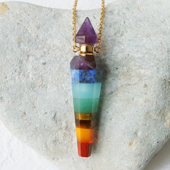 【天然石 Sタイプ 香水瓶 ネックレス 】ペンデュラム チャクラ 1個 アロマ ペンダント ステンレス 7つのチャクラ 虹 レインボー 金属アレルギー対応 国内発送