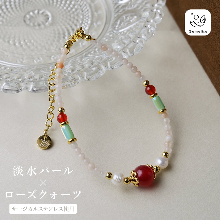 Gemelise ジェメリース 淡水パール×天然石(ローズクォーツ/メノウ)ブレスレット 750462