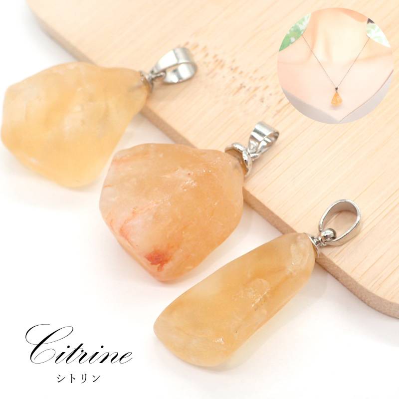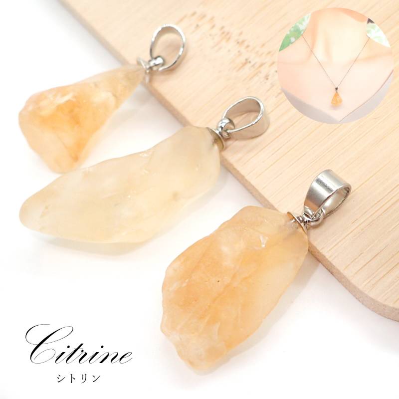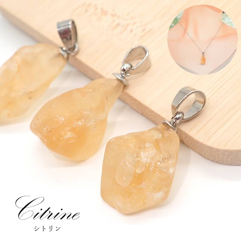 29. シトリン 原石 ペンダントトップ シルバー SUS316 ブラジル産 日本製 1個 サージカルステンレス パワーストーン 天然石 浄化 ネックレス アカネ 自社工場制作