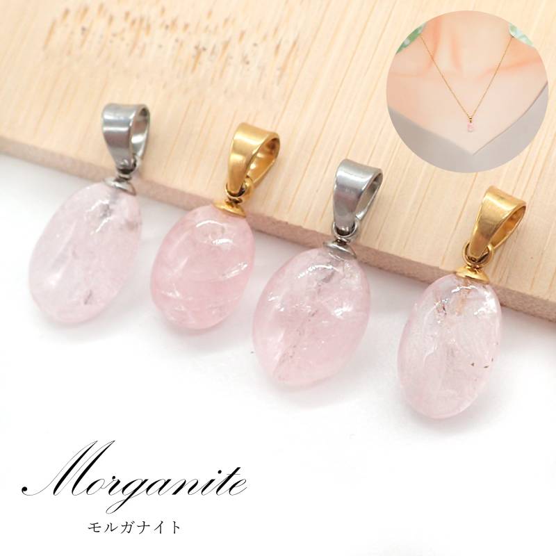 47. モルガナイト 楕円 ペンダントトップ ゴールド/シルバー SUS316 ブラジル産 日本製 1個 サージカルステンレス パワーストーン 天然石 浄化 ネックレス アカネ 自社工場制作