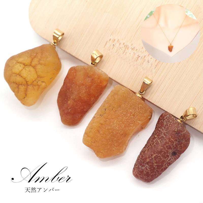 56. 天然アンバー ペンダントトップ ゴールド SUS316 リトアニア産 日本製 1個 サージカルステンレス パワーストーン 天然石 浄化 ネックレス アカネ 自社工場制作