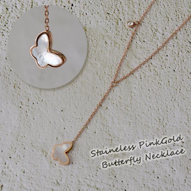 【93】ステンレス ネックレス バタフライ 一粒ストーン シェル ピンクゴールド 金属アレルギー対応 メール便送料無料