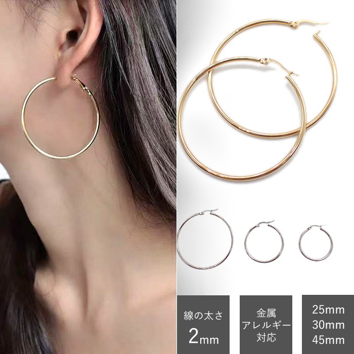 【金属アレルギー対応】フープピアス ステンレス 2mm幅 (25mm 30mm 45mm) ゴールド シルバー シンプル 軽量