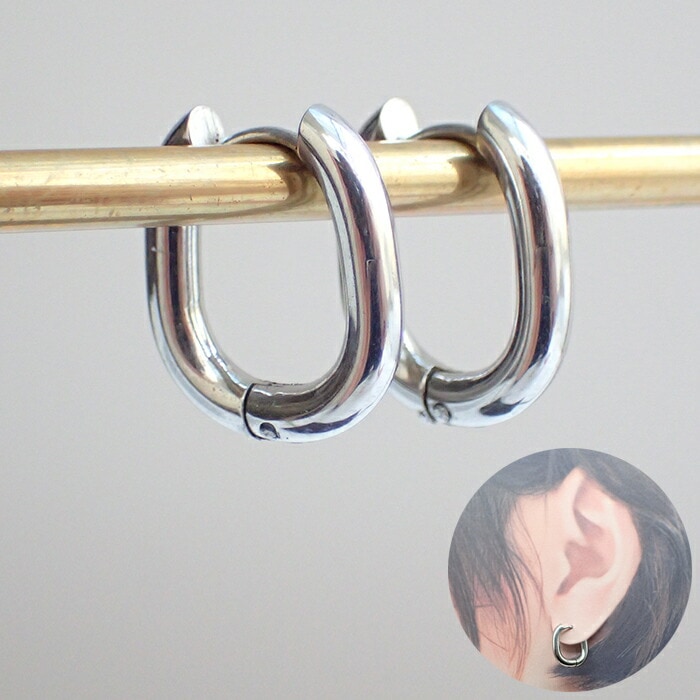 サージカルステンレス【50. ロングオーバル U型 ピアス シルバー】 1ペア 23x13mm フープ つけっぱなし 金属アレルギー対応 変色しにくい