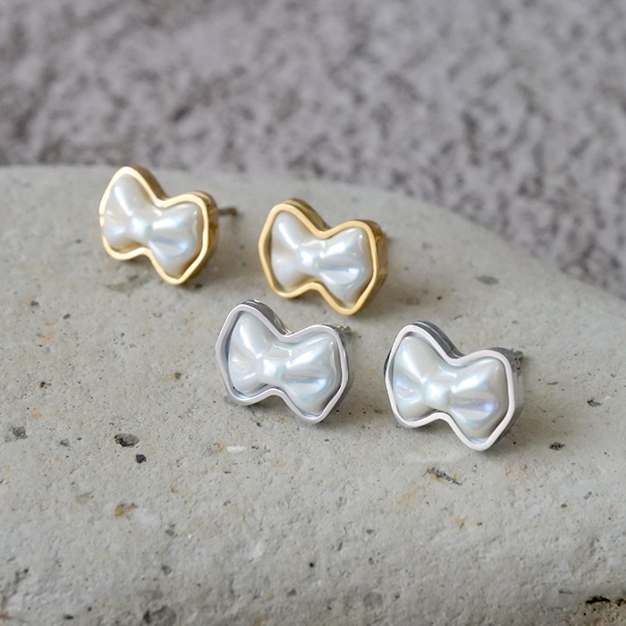 132.ステンレスポスト ピアス リボン オーロラ ホワイト 1ペア 国内発送 金属アレルギー対応