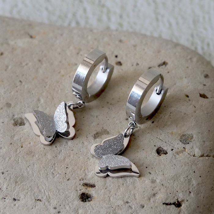 【金属アレルギー対応】 136-S. 蝶 スターダスト シルバー フープピアス 1ペア 国内発送 ステンレス【メール便送料無料】