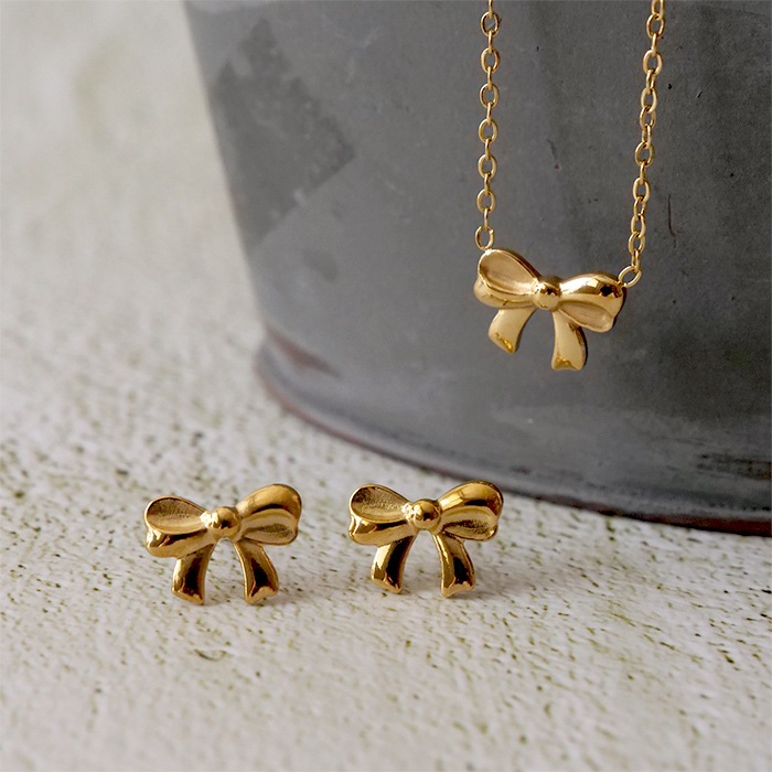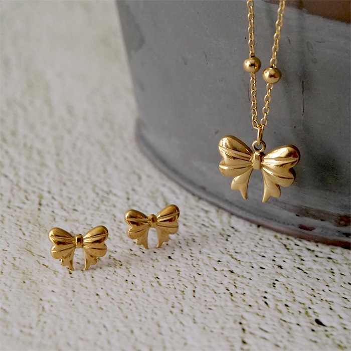 【金属アレルギー対応】 05.ステンレス セット ネックレス ピアス リボンふんわり ゴールド 国内発送【メール便送料無料】