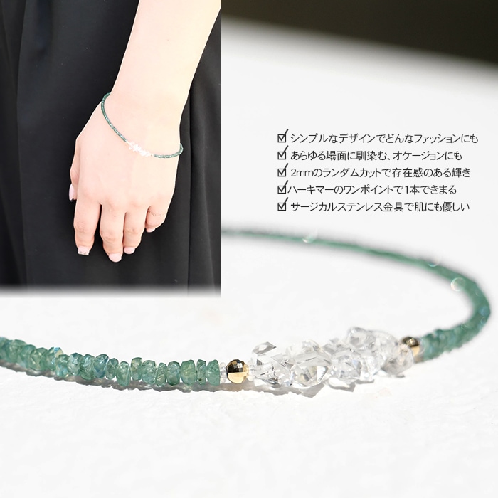 | 仕様 | アレキサンドライトの半貴石とハーキマーダイヤモンドのブレスレット。ステンレス製留め具使用で金属アレルギーの方にも優しい製品です。 色 金具ゴールド |