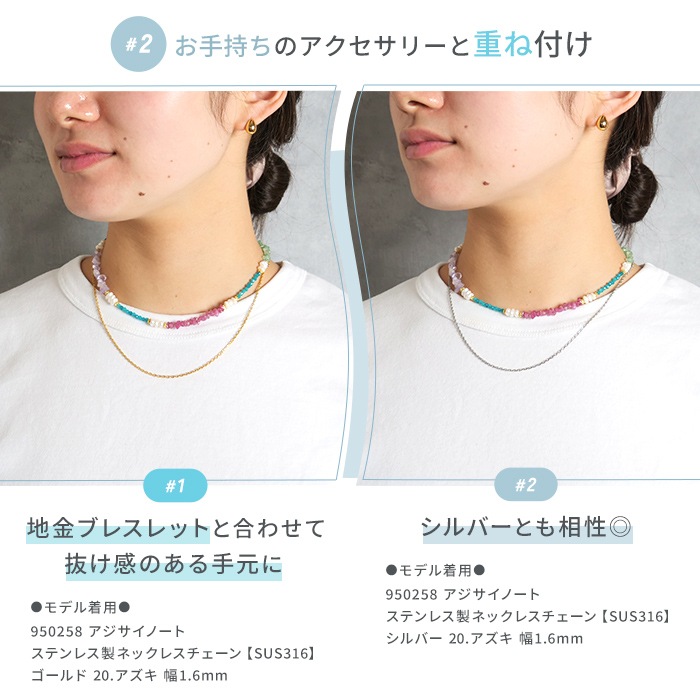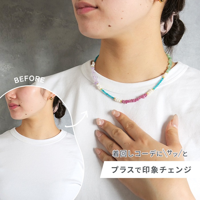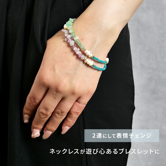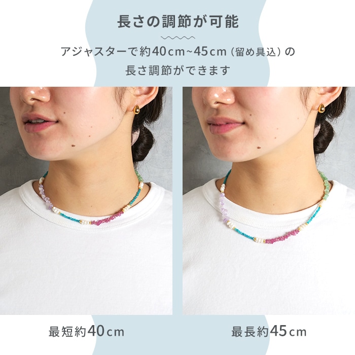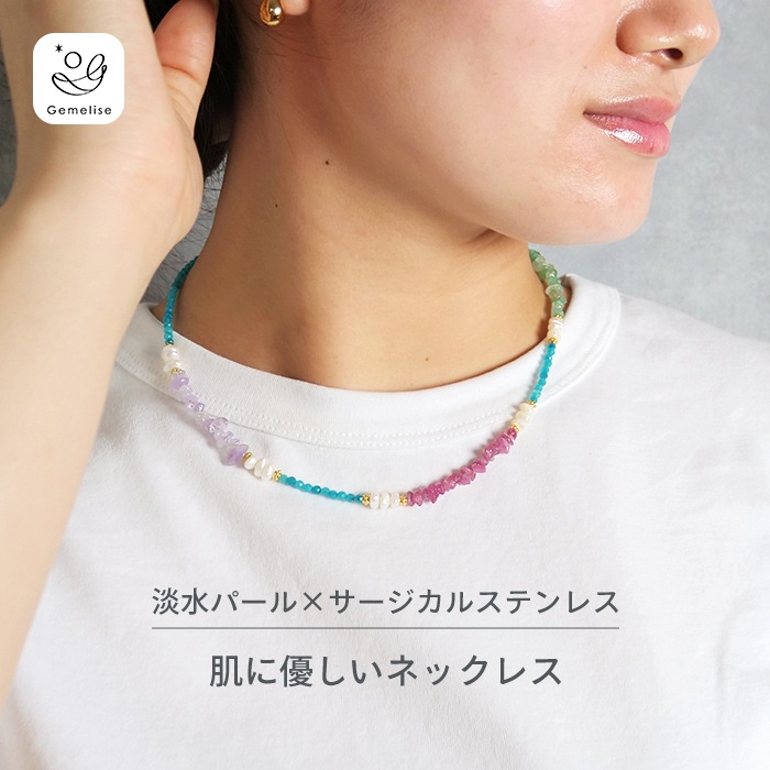 ※淡水パールや天然石など、汗や水に弱い素材を含んでおります。つけたままお風呂に入らないなど、ご使用の際はお取り扱いにご注意ください。