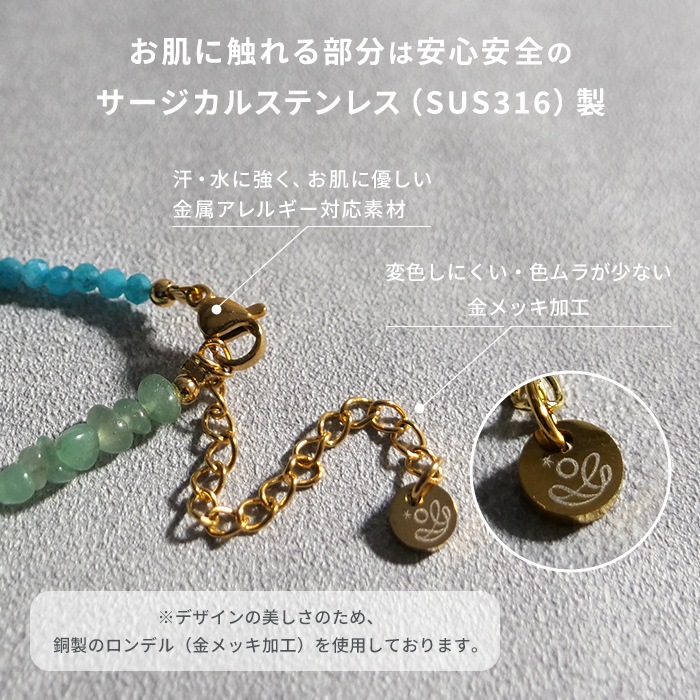 留め具・アジャスター・ブランドタグなど直接肌に触れる金属部分は、金属アレルギーを起こしにくいサージカルステンレス(SUS316)を使用しています。
