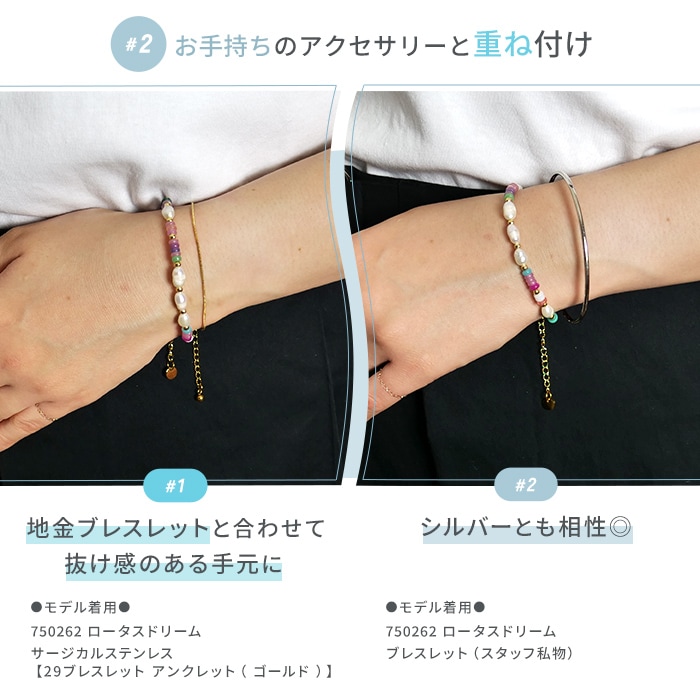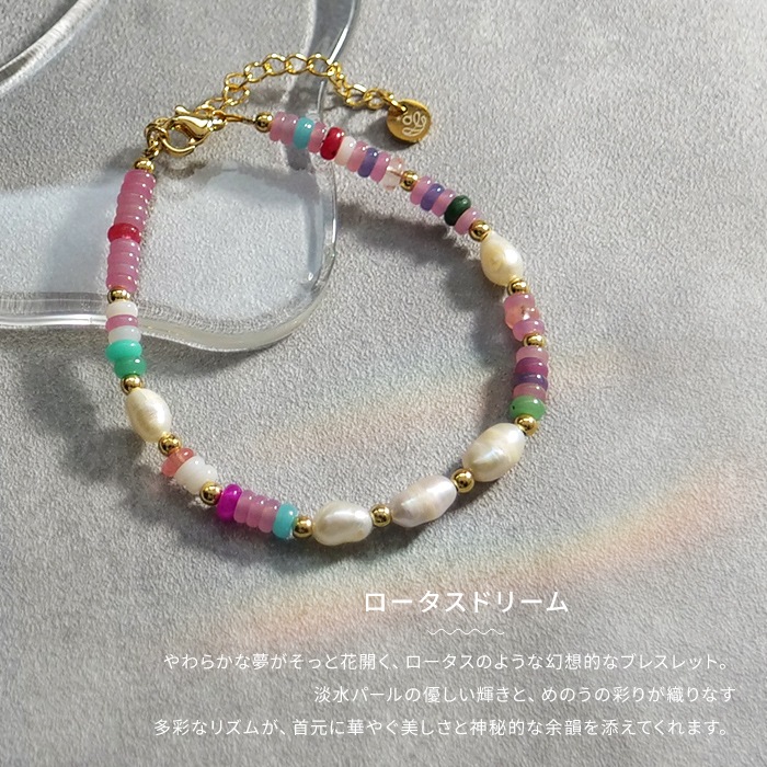 ロータスドリーム。淡水パールの優しい輝きと、めのうの彩りが織りなす多彩なリズムが、手元に静かな美しさと神秘的な余韻を添えてくれます。