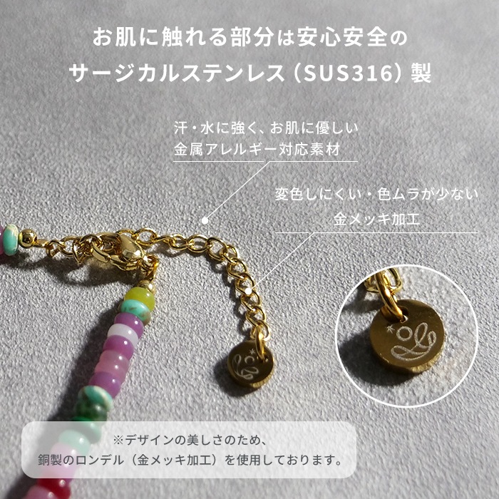 留め具・アジャスター・ブランドタグなど直接肌に触れる金属部分は、金属アレルギーを起こしにくいサージカルステンレス(SUS316)を使用しています。