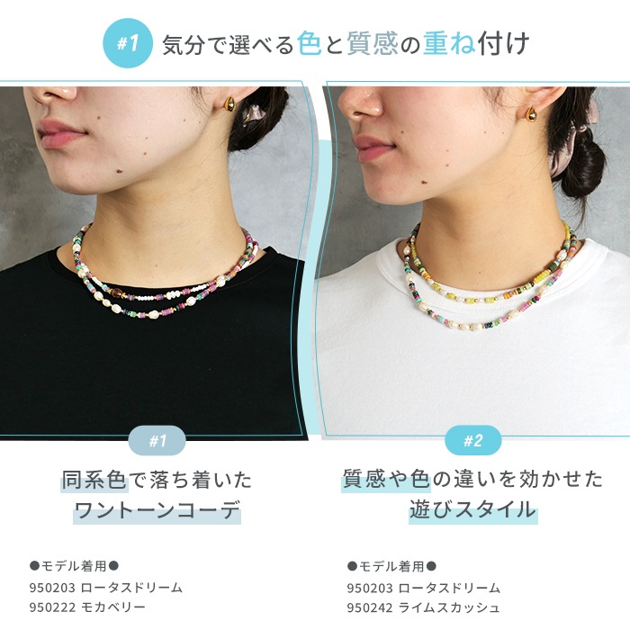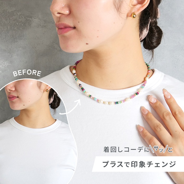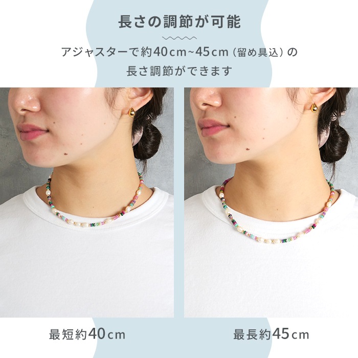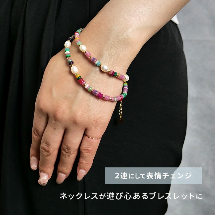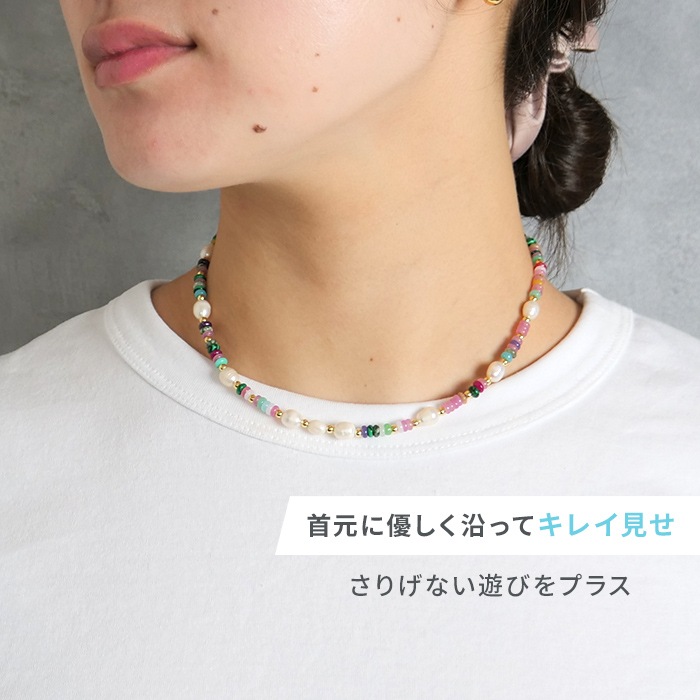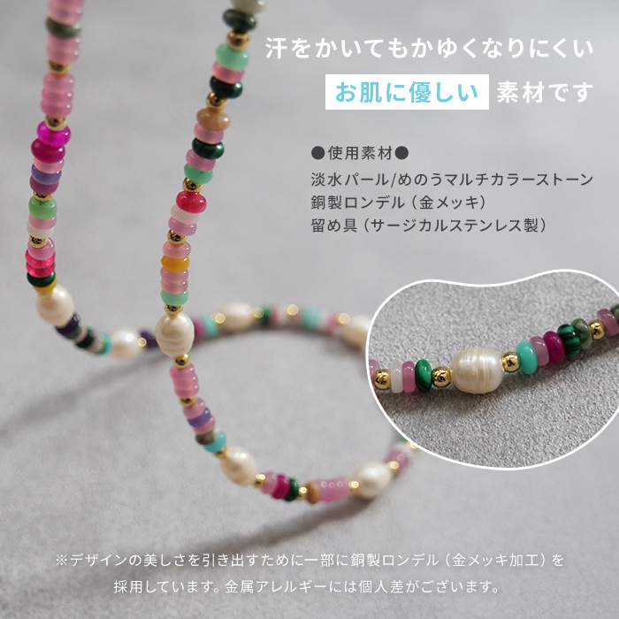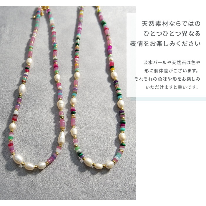 ※淡水パールや天然石など、汗や水に弱い素材を含んでおります。つけたままお風呂に入らないなど、ご使用の際はお取り扱いにご注意ください。