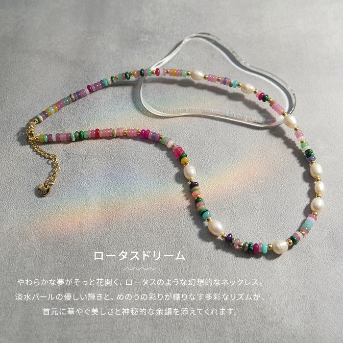 淡水パールや天然石、そして天然石の風合いをもつ人工石のやわらかな色彩に、サージカルステンレスの肌へのやさしさを掛け合わせ、自然素材のぬくもりと身につける心地よさがもたらす“ささやかな幸福感”を込めました。