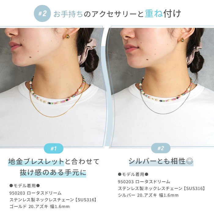 地金のアイテムと重ねて抜け感スタイルを楽しむのもおすすめです。