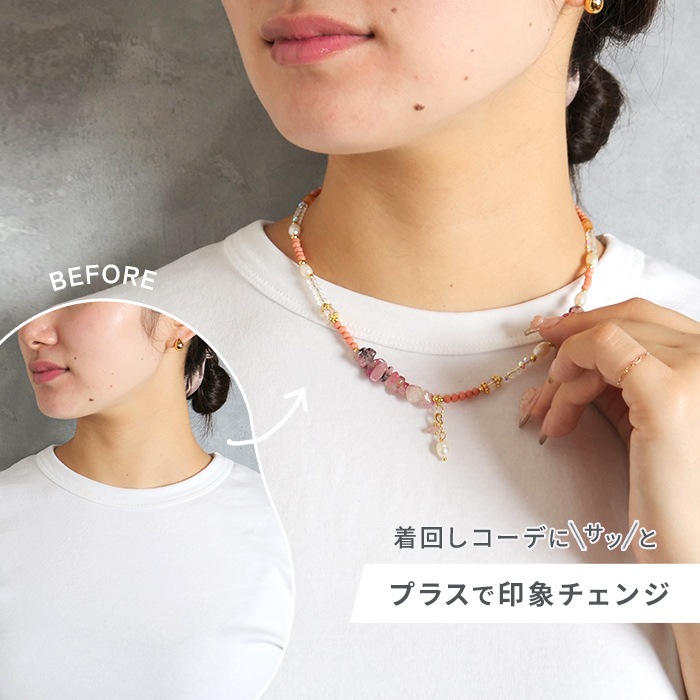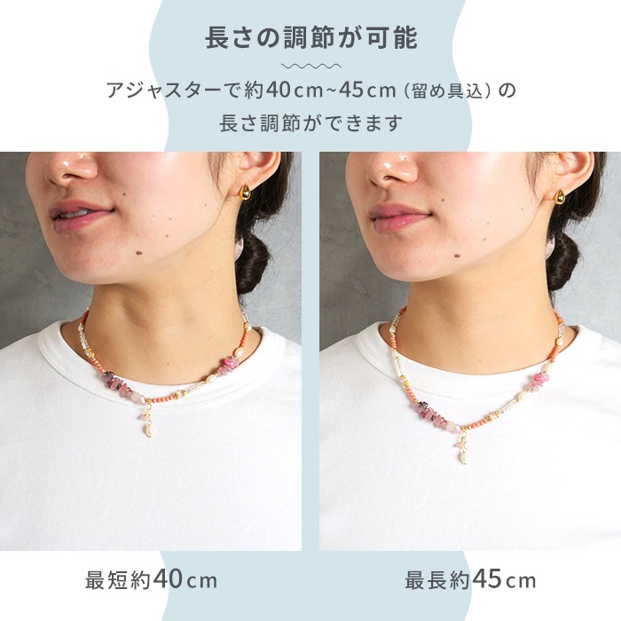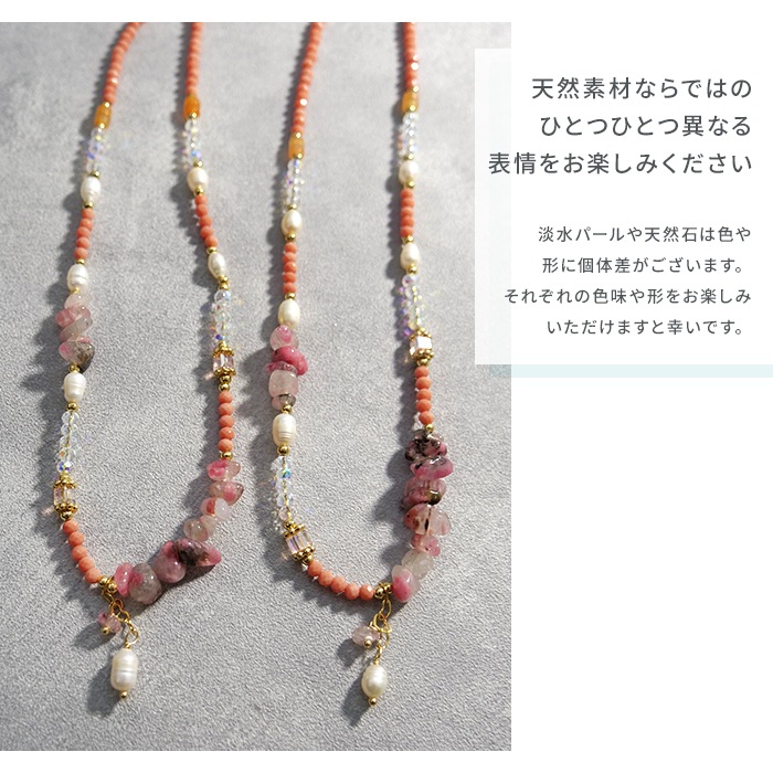 ※淡水パールや天然石など、汗や水に弱い素材を含んでおります。つけたままお風呂に入らないなど、ご使用の際はお取り扱いにご注意ください。