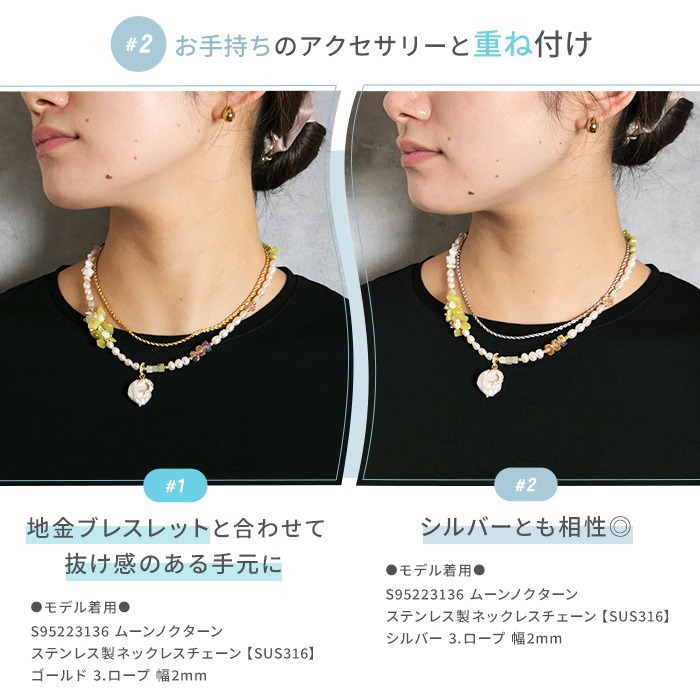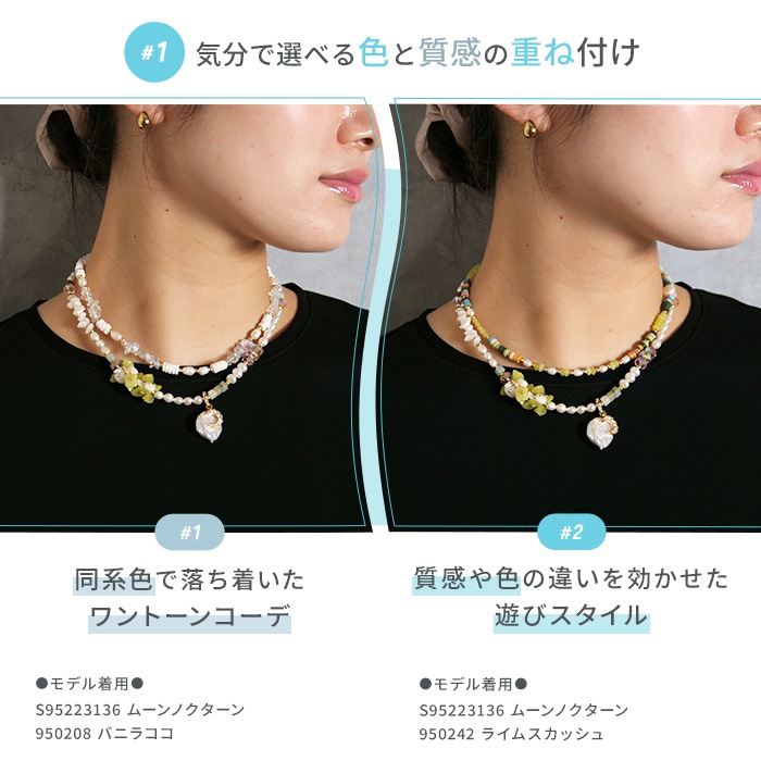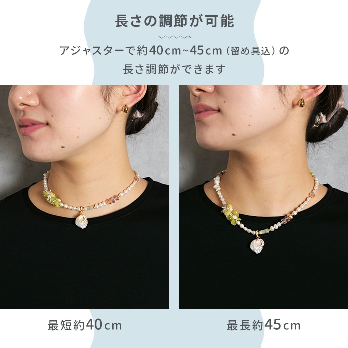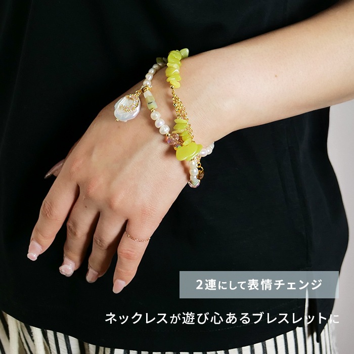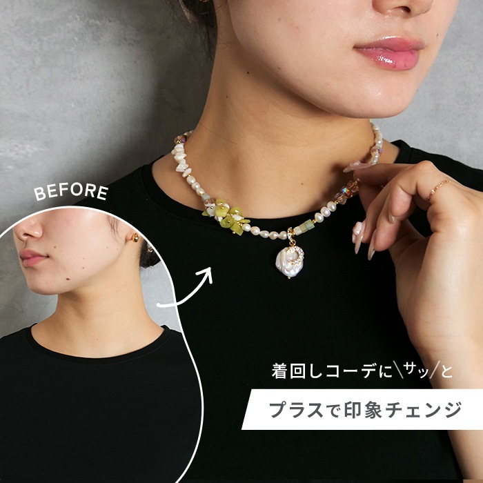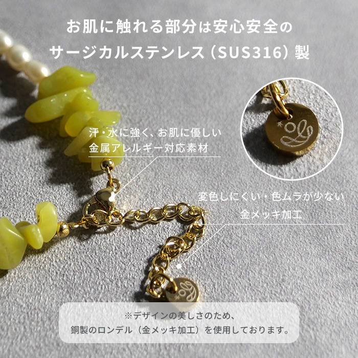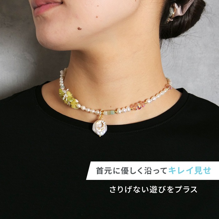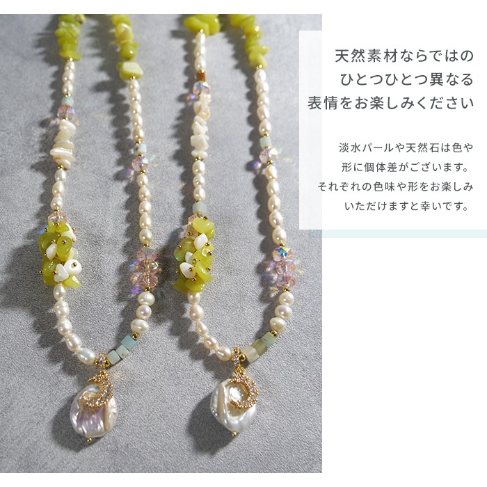※淡水パールや天然石など、汗や水に弱い素材を含んでおります。つけたままお風呂に入らないなど、ご使用の際はお取り扱いにご注意ください。