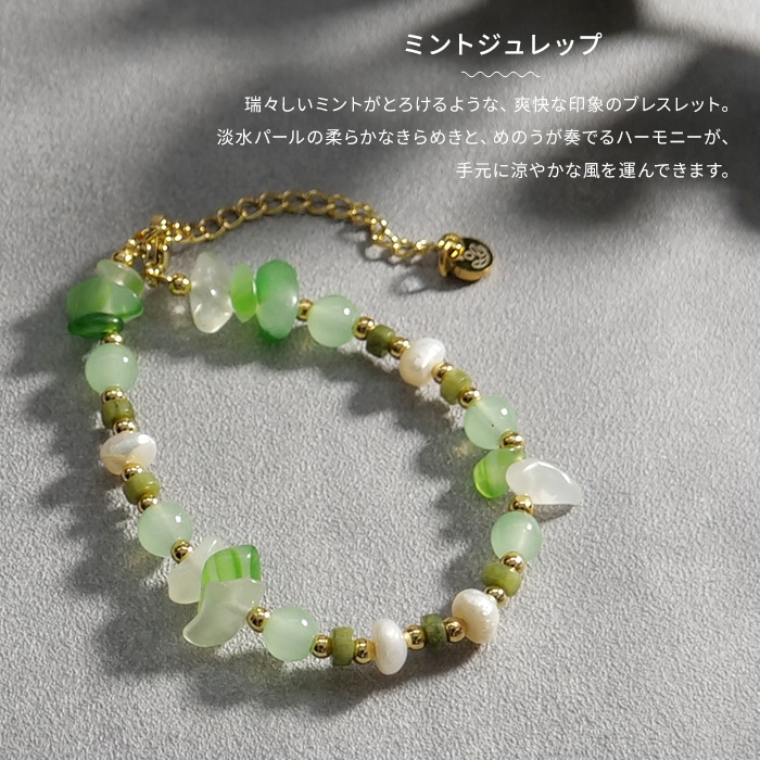 ミントジュレップ。淡水パールが柔らかなきらめきを添え、めのうとガラスビーズが奏でる涼やかなハーモニーが、手元に夏の風を運んできます。