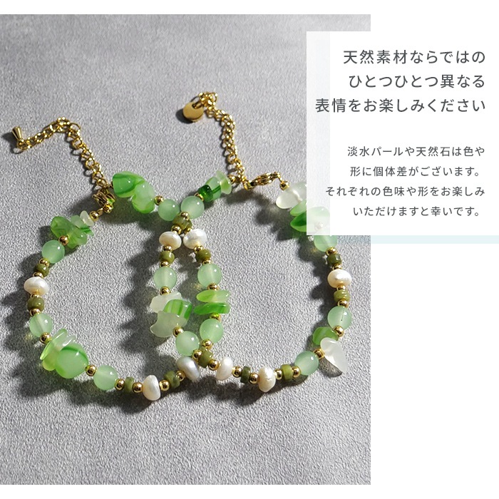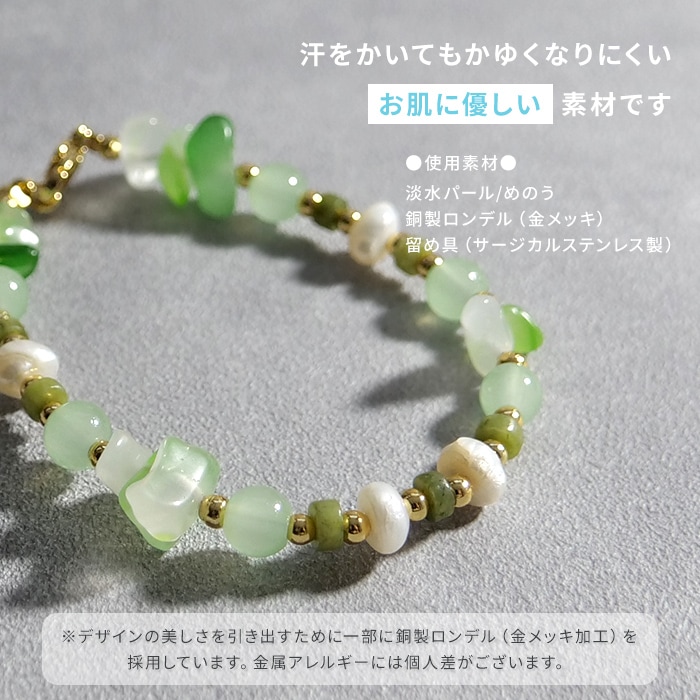 - 淡水パールが柔らかなきらめきを添え、めのうが奏でる涼やかなハーモニーが、手元にさりげない上品さをプラスします。