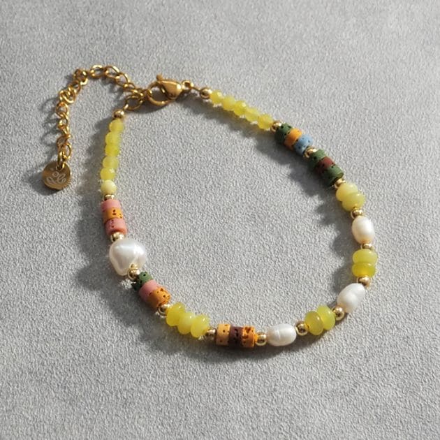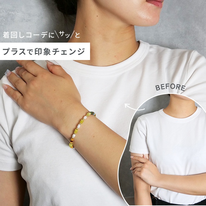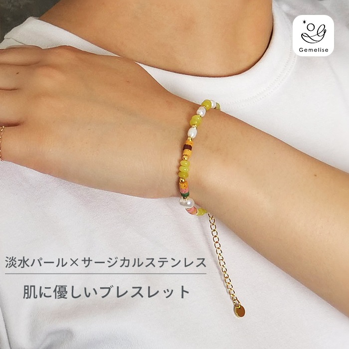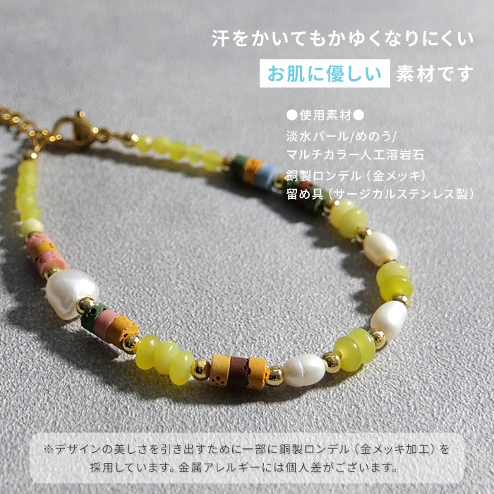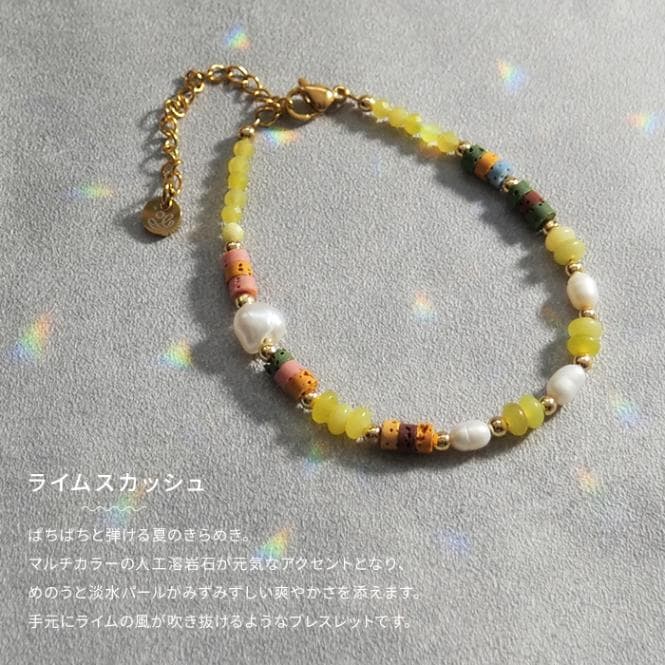 ライムスカッシュ。マルチカラーの人工溶岩石が元気なアクセントとなり、めのうと淡水パールがみずみずしい爽やかさを添えるブレスレットです。