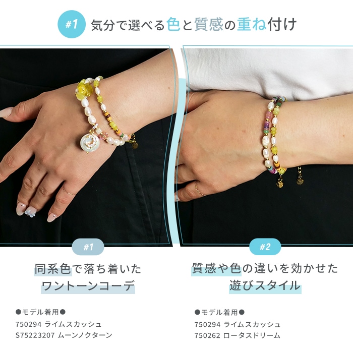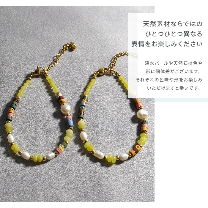 - マルチカラーの人工溶岩石が元気なアクセントとなり、めのうと淡水パールがみずみずしい爽やかさを添えて、手元に明るさとさりげない上品さをプラスします。