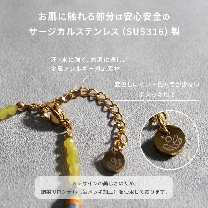 留め具・アジャスター・ブランドタグなど直接肌に触れる金属部分は、金属アレルギーを起こしにくいサージカルステンレス(SUS316)を使用しています。