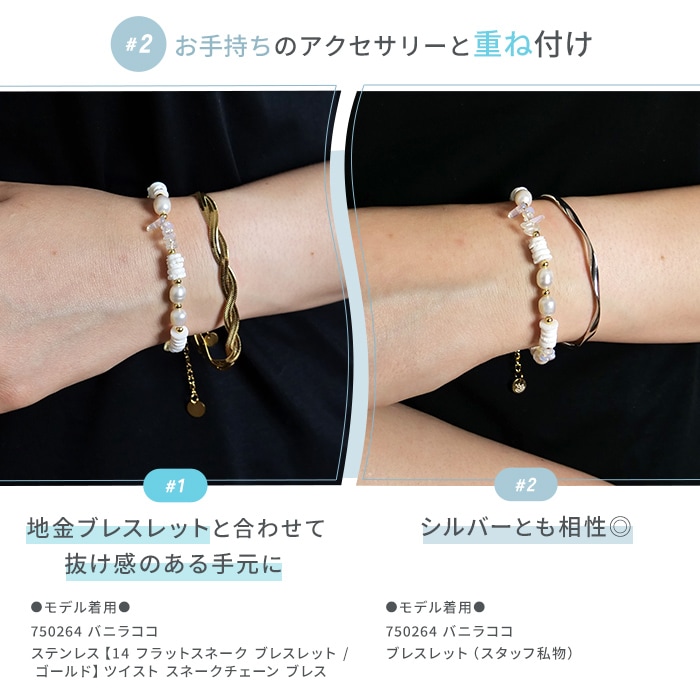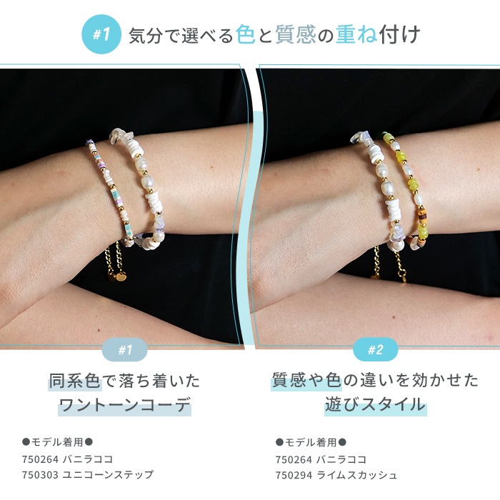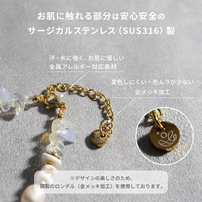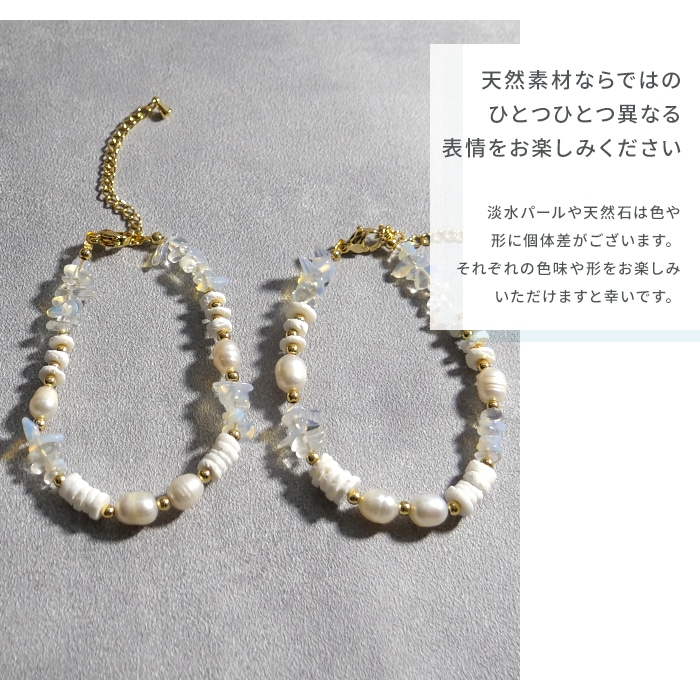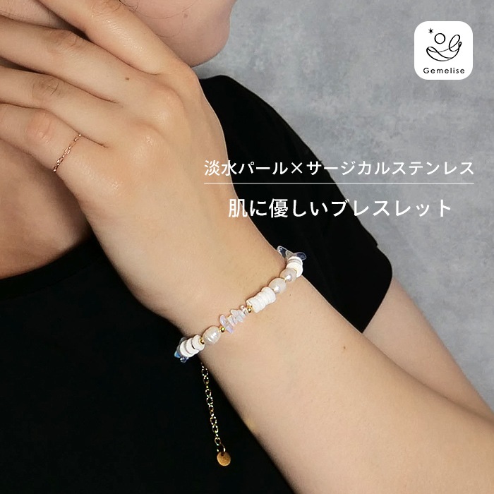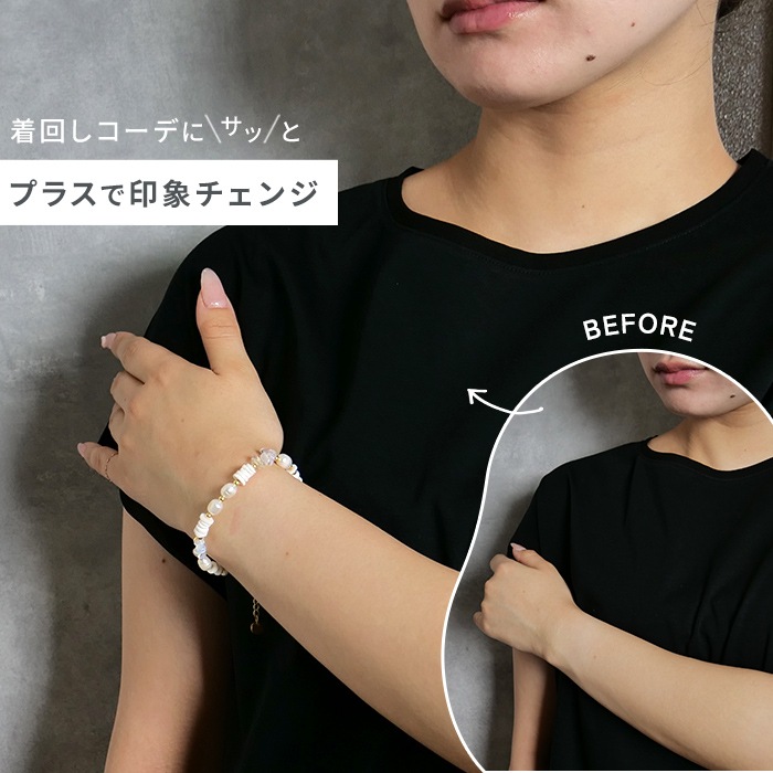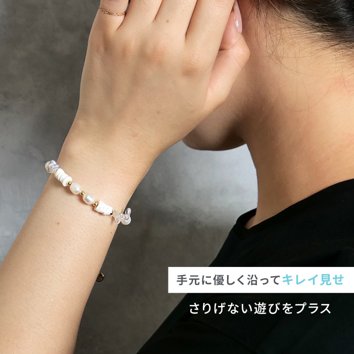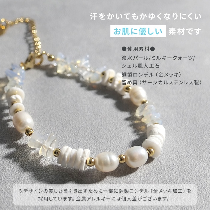 シェル風人工石とミルキークォーツが描く柔らかなニュアンスに、淡水パールがきらめきを添えて、手元に明るさとさりげない上品さをプラスします。