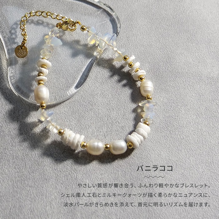 バニラココ。シェル風人工石とミルキークォーツが描く柔らかなニュアンスに、淡水パールがきらめきを添えるブレスレットです。