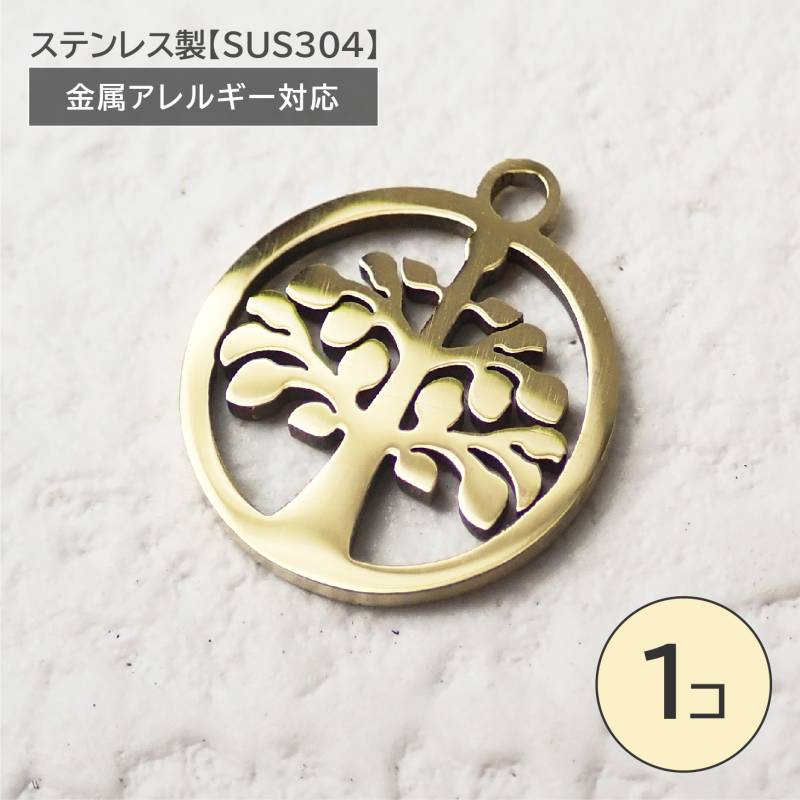 ステンレス製【SUS304】 金属アレルギー対応 ゴールド 円形 ツリー 木 チャーム カン付き